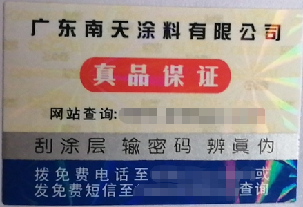 在鉴别假冒伪劣产品上,南天涂料的每桶产品都有对应的防伪标签,桶身有二维码扫描确认,其次可以进入南天涂料官网在线查询或是拨打南天涂料公司服务电话查询。