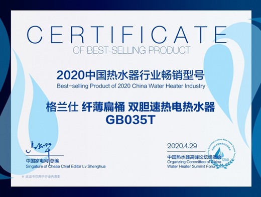 格兰仕双胆速热电热水器GB035T荣获“2020年中国热水器行业畅销型号”,以创新性双胆加热结构,解决热水加热慢的问题,不论是从行业认可、消费者喜爱,还是市场热销等多方面均获得实力认可。