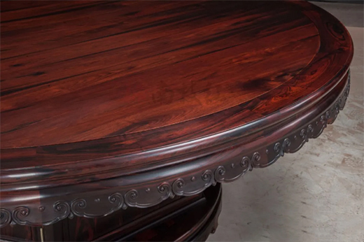 南枝红为客户定制圆餐桌不在少数,今天为大家分享的一套客订颇为恢弘大势,直径达2.38米的圆桌,配备了12件四出头官帽椅,为符合现代餐桌多人进食的需要,加配了转盘。而让人神往不已的,是全桌均使用了大红酸枝(交趾黄檀)的芯材,细看其油性纹理,无不隐隐透着木材的在历经了岁月洗礼下沉淀的稳固气息。