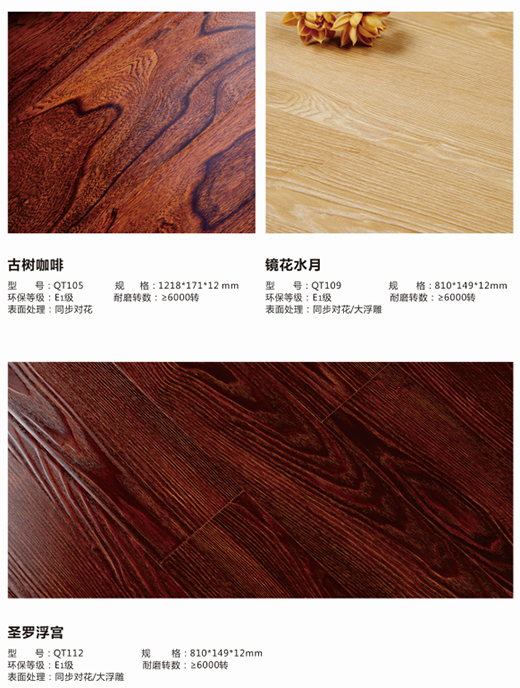 清晰的纹理质感,饱满的色泽展现源自金典系列地板的镂铣工艺,艺术感与木质感完美融合,顿时美态具现,扱具视觉冲击。融合六大抗磨技术,一次模压成型;使用高密度纤维板环保基材,安全健康;独有的镂铣工艺技术,打造凹凸有致的动感效果;表面采用半哑光处理,色彩柔和,画面清晰。