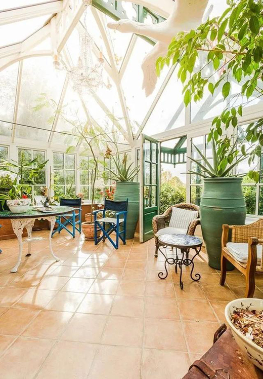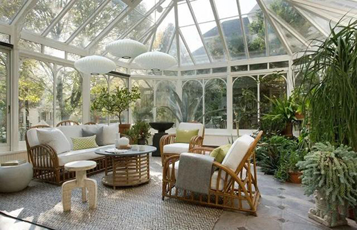 阳光房里种株植物是不错的选择,不但可以装饰,还能净化空气,可以选择种植攀爬的植物形成绿色帘幕,遮挡着烈日直射,起到隔热降温的作用,让阳光房在夏日里形成清凉的小环境。