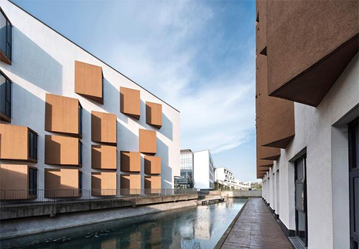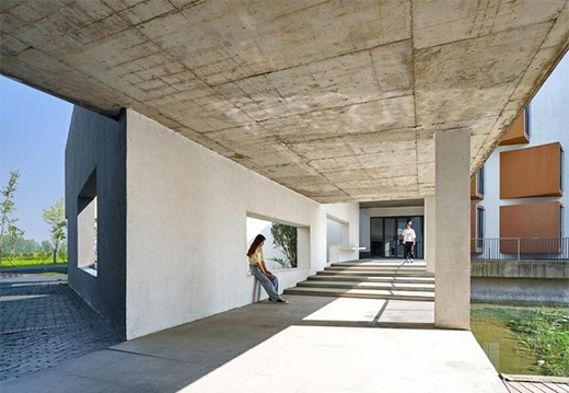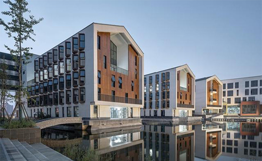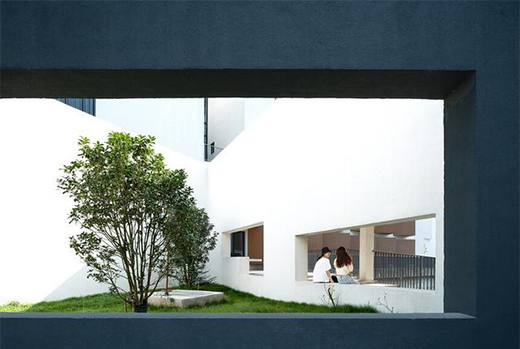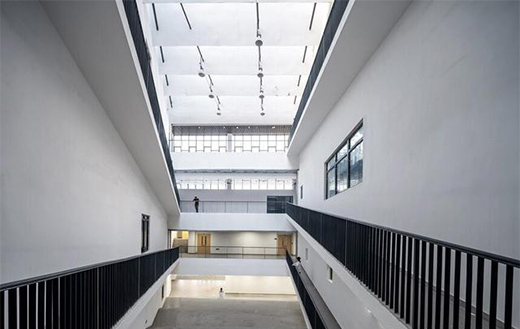 其中音乐北楼东侧两翼架设于水面之上,底部形成亲水平台,上部则设有两层高的取景口。同时,与相邻建筑采用连廊加强联系,宜人的小空间柔化了建筑的尺度。位于主门厅二层的小音乐厅,采用深灰色大悬挑体量,强调出其在整个教学群中的独特性。由于教学排练区与琴房区层高差异,设计巧妙利用坡道将不同标高联系起来,并形成通高的共享音乐中庭。在充满自然光线的空间中游走,体会建筑与音乐交融的魅力。