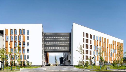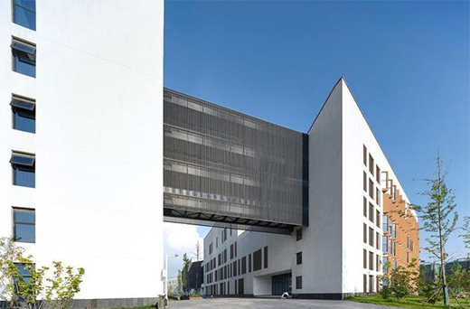音乐楼位于安徽艺术学院西区教学组群西南角,是校园东西景观轴的收尾。建筑由南侧教学楼和北侧琴房楼两栋组成,二者在4-6层由廊桥联系,廊桥下部形成3层高的巨大门洞,与校园西大门道路对应。建筑临校园环路的外侧,采用连续界面与其它专业教学楼形成整体,朝向内侧的界面则曲折丰富,与景观绿化产生积极的互动。