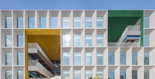 龙华区教育科学研究院附属实验学校,首次在中小学尝试采用装配式设计,在学校城市面外墙,通过一系列减法处理与色彩变化,让PC不再是简单重复,其产生的韵律感、力量感,贯彻始终。