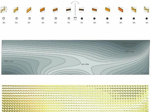 此时的表皮形态是生动且复杂的,其功效在于减弱环境特殊情况(比如光照条件的变化)所带来的影响,使室内的工作环境更加稳定。与此同时,针对实际建造成本和施工难度的考量,设计师将立面上千奇百怪的肌理,归纳、统一成为可以实现批量生产的标准模块和组合方式,避免过度超出预算的情况出现。