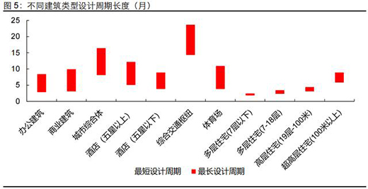 项目周期相对较短,各阶段工作量从大到小依次为施工图设计>方案设计>初步设计>施 工配合。从《全国建筑设计周期定额》(2016 版)来看,相比于工程项目,设计项目周 期偏短,其中居住类建筑设计周期仅 2-9 个月不等,办公、商业建筑设计周期略微偏长, 在 3-10 个月不等,周期最长的综合交通枢纽设计周期也仅 14-24 个月;从工作量分配 角度来看,根据中国勘察设计协会建筑设计分会发布的设计各阶段工作量分配参考来看, 施工图设计工作量最大,占在 45%-59%之间,方案设计在 15%-25%之间,初步设计在 18%-22%之间,施工配合占比 7-8%之间。