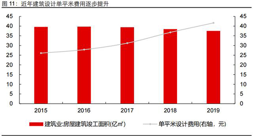 从需求拆分来看,近年下游建筑面积相对稳定,设计单价有所提升。若以“建筑面积*单 平米设计费用”拆分建筑设计市场规模,可以看到近年全国房屋竣工面积(包括住宅、 商业、办公、科教医疗、文体娱乐、厂房、仓库及其他建筑面积)总体相对稳定,2013 年以来维持在 38-40 亿平米之间窄幅震荡,而单平米设计费用则实现逐步提升,根据我 们前文对建筑设计市场空间的测算,2015-2019 年建筑设计单平米收费分别为 26 元、 28 元、31 元、37 元、42 元,我们认为或主要源于近年物价上涨及设计企业人力成本 持续上升推动。