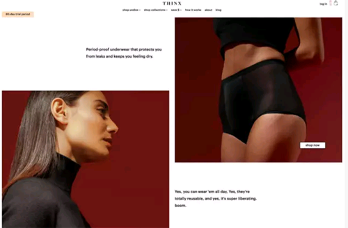 Thinx这个案例我非常喜欢,并且经常会用到,因为它证明了设计师并不一定非得靠高饱和度的霓虹色来创造高对比度的配色。即使是两种平衡的颜色,也能让整个设计脱颖而出。