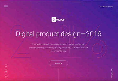 除开其他的目的,设计师使用色彩或者调整色彩的目的,基本都是为了创造设计的一致性。InVision的年度总结页面使用了从粉色到紫色的渐变,在页面的下方,粉色和紫色同样应用到了按钮中,此外,在着陆页当中,将对比度明显的白色置于粉色+紫色的背景之上,确保信息的清晰呈现。如果色彩每次都不一样,那么整个设计看起来就不是那么令人难忘了。