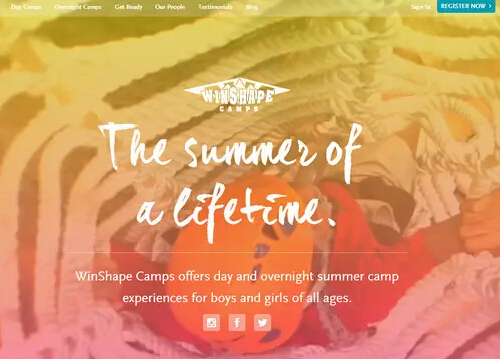Winshape Camps有着梦幻般欢乐有趣的网页设计。主页包含了一段全屏视频介绍,也有效地与炫丽的半透明渐变背景融合,成为功能的一部分。