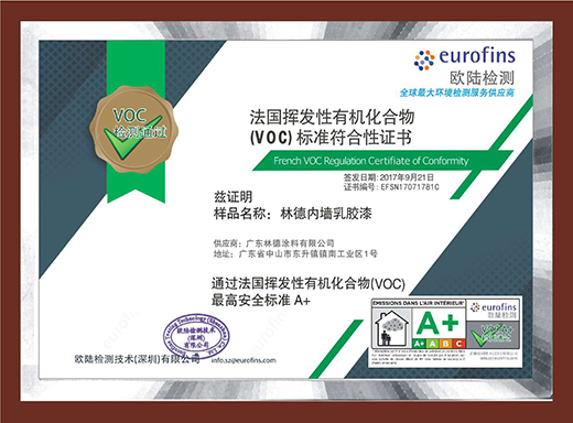 此外,林德漆还通过了国际权威环保认证——法国挥发性有机化合物(VOC)检测A+级环保认证,该认证以欧洲建筑产品指令(CPD)为基础,对甲醛、苯系物及其他有害健康的VOC都有严格的排放限制。来自国际的权威认证,正彰显出林德漆从源头控制家装污染的高环保效能。