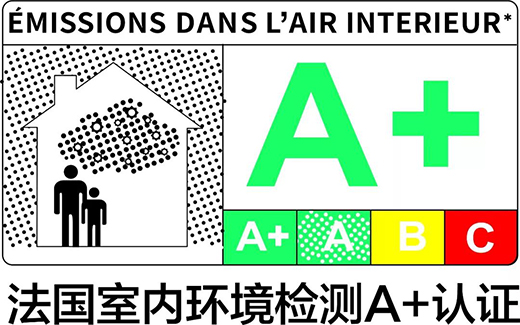 “法国A+”是法国VOC标签中环保等级最高的标志,Émissions dans l'air intérieur,英语对应为 Emissions in indoor air,汉语为“室内空气中排放物”。