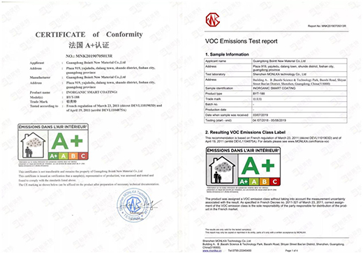 2019年8月,铂英特涂料顺利通过法国挥发性有机物(VOC)最高安全检测,获得有涂料界“奥斯卡”之称的“法国A+认证”。
