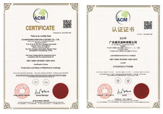 作为环保健康的涂料专业生产商,获得此证书标志着南天企业的制造水平和质控管理能力再上新台阶。同时证明了南天在环境管理方面达到了国际水平——在生产和施工的过程中,确保做到对各类污染物量的控制达到相关国际要求,进一步为环境保护贡献力量。