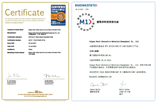最新升级后的立邦儿童漆在原有品质认证的基础上增加获得“哮喘和过敏友好®️”产品认证和芬兰M1认证