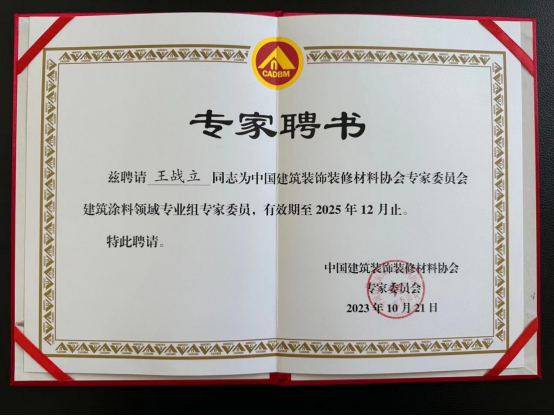正是凭借着自己的专业知识和丰富经验,王战立先生在今年3月举办的全国建筑涂料行业年会暨全国建筑涂装职业技能大赛总决赛上,被《中国建材报》聘请为“中国建材报涂料行业智库专家”。这份聘书不仅是对王战立先生过去在培养技能人才和推动行业发展方面所作出贡献的认可和肯定,更是对他未来工作的期望和信任。