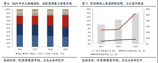 完美日记伴随Z世代、国货潮流兴起,偏营销型打法。历经4年发展成功上市,市场份额主要归功国内。欧莱雅历经百余年发展,以研发为主,已遍布150多个国家,拥有36个品牌。在2019年,亚太地区成为欧莱雅市场份额最大地区。