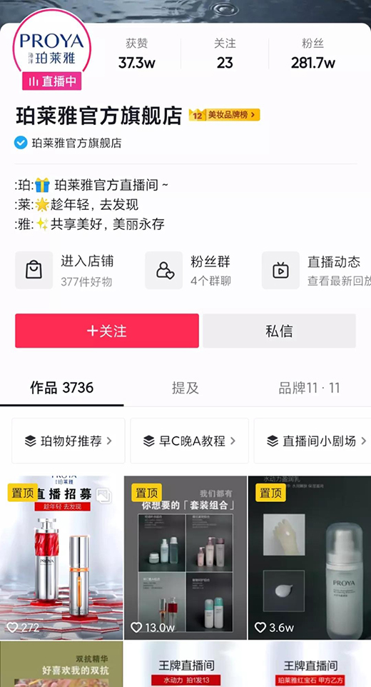 当其他品牌仍在犹豫是否开启自播时,珀莱雅官方账号在抖音平台已坐拥百万粉丝。