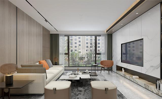 电视机墙做了整面柜子,柜面仿大理石纹理造型,电视机内嵌处理,整体更加简洁易打理。