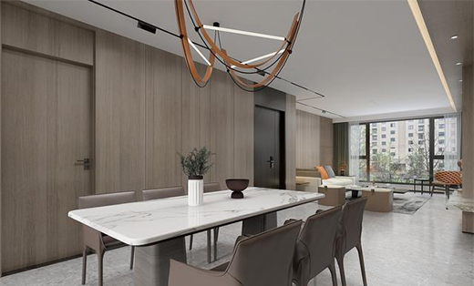 餐厅一侧的墙面用的是同色系的护墙板,餐椅的选择也是棕色,但是白色大理石餐桌打破了整个空间的视觉,让人眼前一亮。