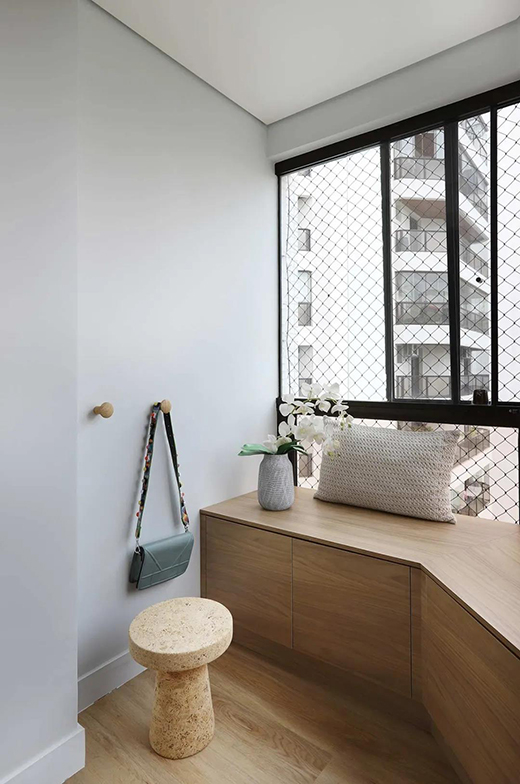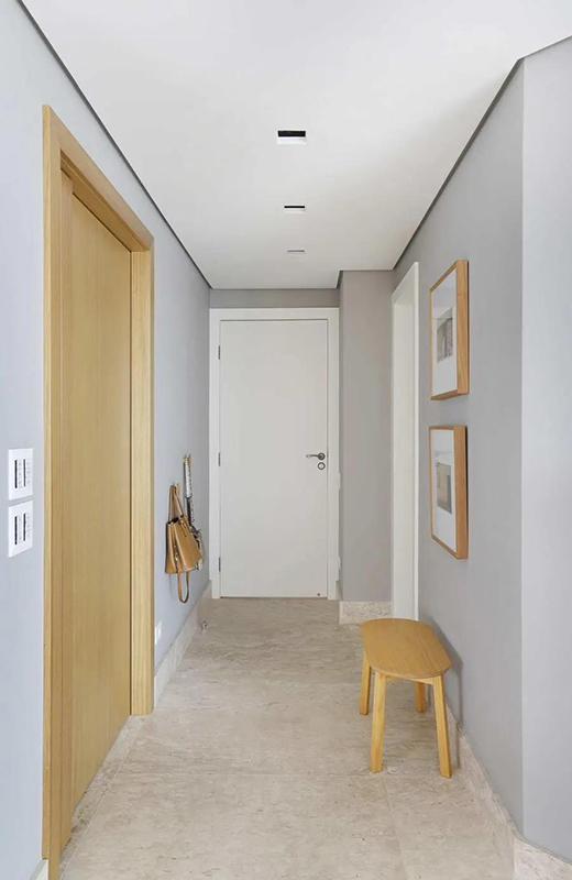 从玄关到室内过渡的便是这过道区域了,空间也不能浪费,墙面搭配挂钩,可以用来做挂放进出门的包包和外套。