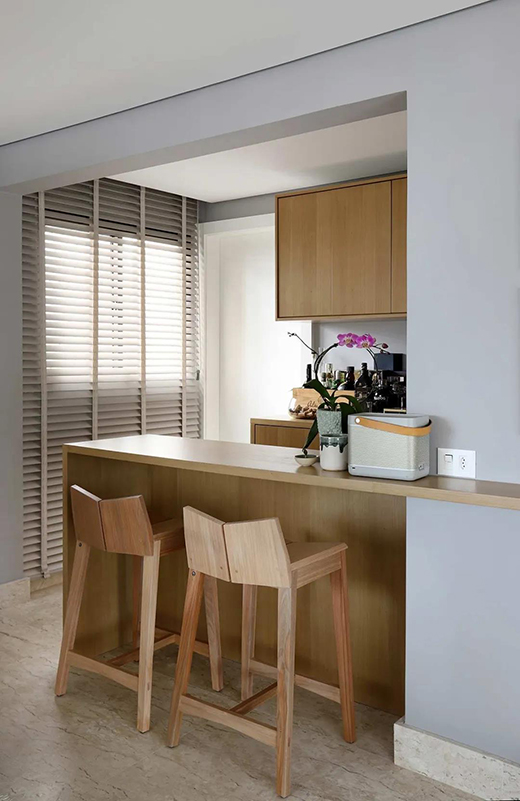 一半是储物区包含吧台区,一半是洗切炒动线区,分工有条有理,操作方便实用。