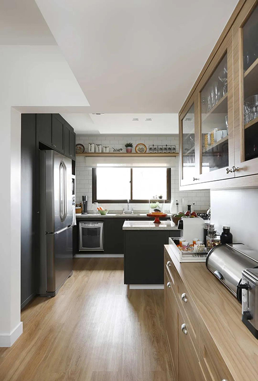 考虑到储物空间也足够了,这家人最后选择舍弃传统吊柜,而是以一排L型长搁板代替,做简单的置物收纳。
