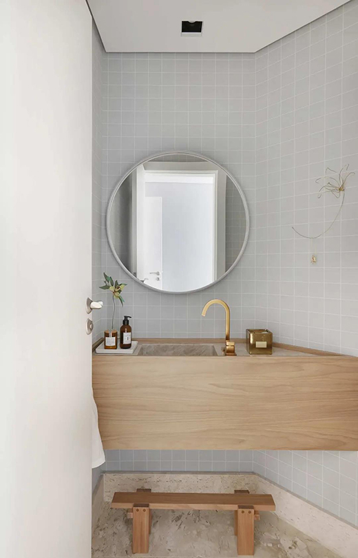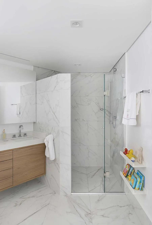 这间独卫也是搭配给孩子单独使用的,靠近地面的墙上设计了隔板,用来放置小孩洗澡时喜欢的玩具。