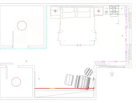 在这个空间中,射灯的应用相对克制。除了床尾和梳妆台主打照明的射灯,另外三处射灯的主要目的是洗墙装饰,次要目的才是提供基础照明。因此,射灯都布局在墙面中线、靠墙的地方,形成完美的装饰性洗墙光斑,提升卧室氛围。