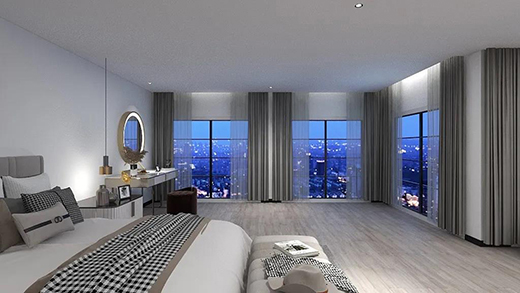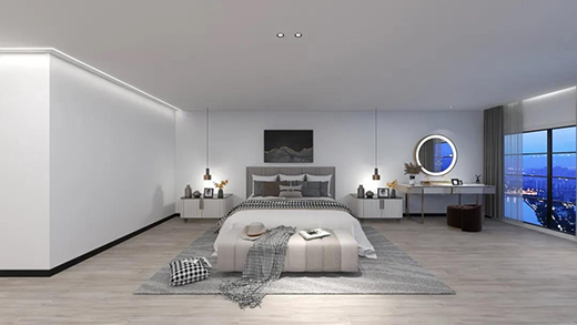 线性光与卧室是最佳CP,窗帘盒的藏灯、沿着走廊进入卧室的天花灯带,奠定了卧室的灯光基调。