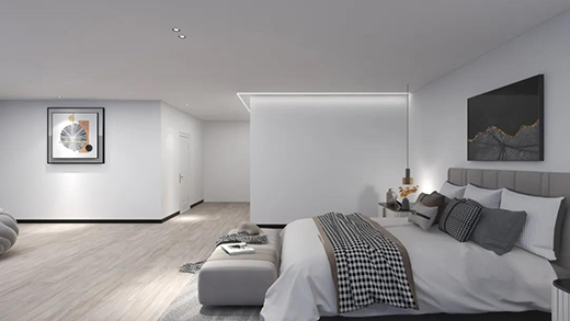 卧室的活动需求不高,设计灯光时,切忌太亮。下面这个案例卧室面积较大,没有铺过多的光源,更注重光的美感与氛围打造。