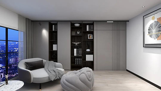 床尾阅读区用磁吸轨道灯照明,射灯头为阅读提供专注的亮度,可以悠闲地在沙发上看书,泛光条则为书柜提供基础照明。磁吸光源可以在轨道上灵活移动,更换沙发布局时,灯光也能跟着移动。