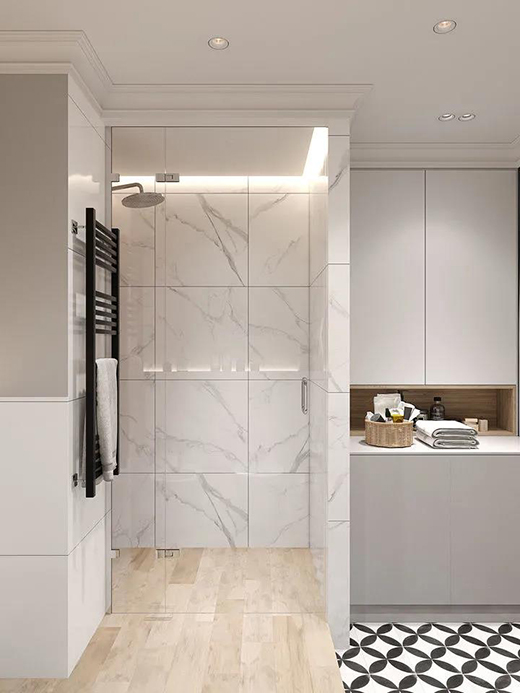 淋浴区加光源,仰头不会直接刺眼、不被顶喷花洒挡住是关键。