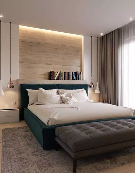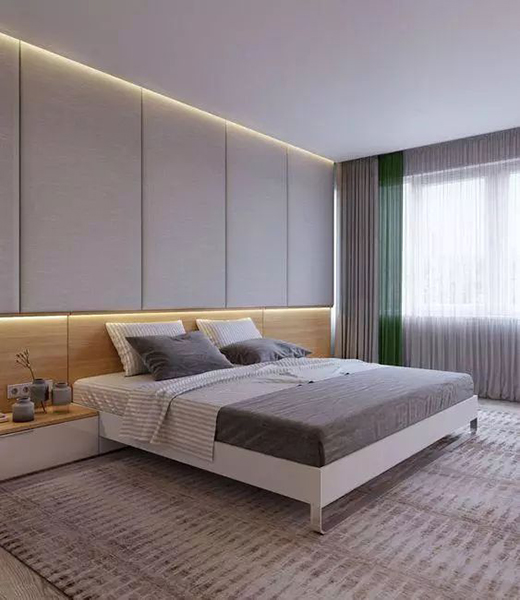 A. 分散在卧室的天花板安置灯带,以及床尾部分安装射灯,整体的照明,不至于刺眼。