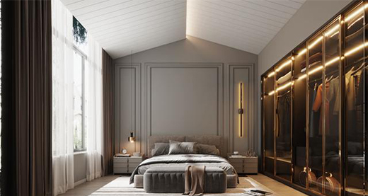 主卧室设计师利用原顶面的鞋面造型,结合做出人字形造型顶,内侧还增加了线型灯,满足了无主灯的空间设计,利用米灰色主调做墙面结合石膏线,精致感十足,床体左侧是半高窗台,采光性十足,右侧是长长的玻璃式衣柜,墨色设计更为空间凸显设计感。