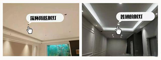 ①见光不见灯:安装防眩的射灯后,每当打开灯来照明时,从远处只看到暖暖的灯光却看不到灯,走到近处后才看到灯隐藏在吊顶的石膏板内。