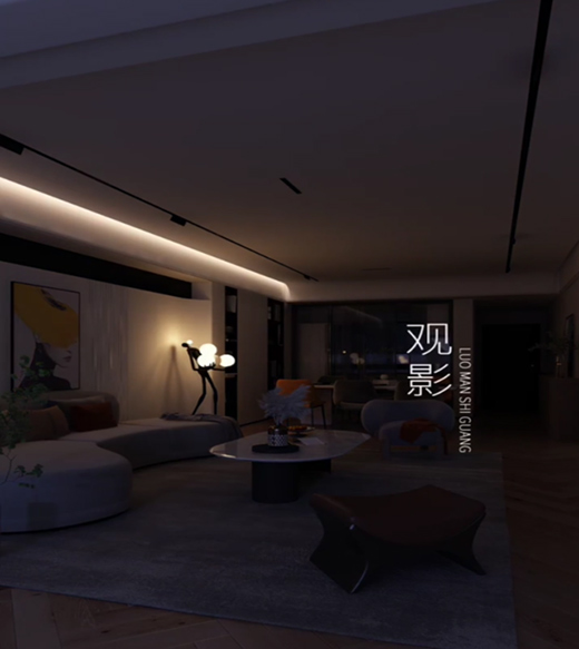 另外的话可以看一下其他的,比如说是我们的一些这个休闲模式,这是整体全亮。你比如在休闲模式下的话,我们可以看到就是我们的一些主要的基础照明可以打亮,然后我们其他辅助光源辅助慢慢亮起来。然后我们可以切换观影模式,在观影模式下的话,我们整体灯光的主要照明基础照明可以关闭,那么辅助光源的亮度可以调整20%。然后在这样一个情景模式下的话,我们去观看我们喜欢的一些影片,然后跟我们的亲人爱人能够坐到一起,然后体验我们整体在电影院的一个感觉。你想前面的大屏后面整体的这个这个氛围光,然后保证整体的这样一个空间是不错的感觉。