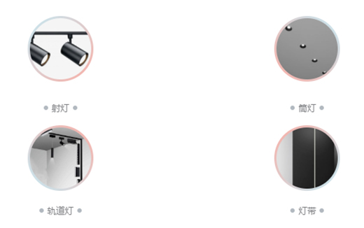 射灯是典型的无主灯,无定规模的现代流派照明。射灯光线柔和,可以营造室内照明气氛,也可用于局部采光,还可以自由组合变换角度,照明效果千变万化。