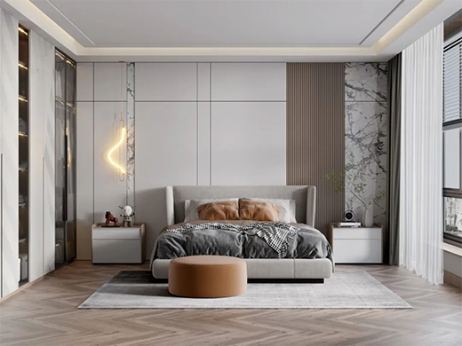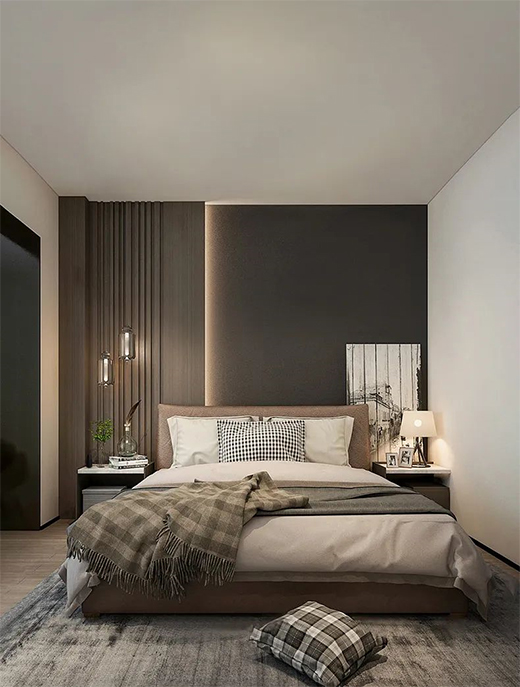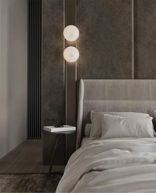 卧室是私人空间需要安静的环境,考虑照明、起夜、阅读灯多重功能,过强、过白都不合适。小小提醒,灯光适宜在床尾或者走道的位置,千万不要在床的上方直射。