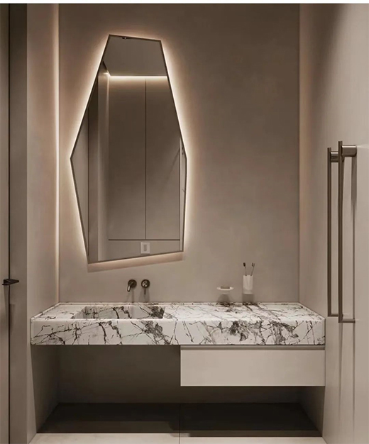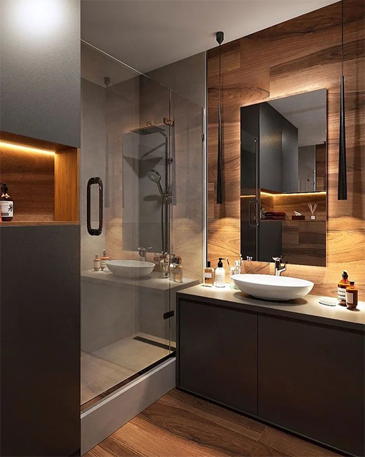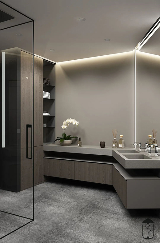卧室常用的灯具选用镜前灯或者内藏灯带,需要注意的是淋浴间花洒最好不要装射灯等,容易被挡住光线甚至反光,洗手台的灯需要考虑防水性。灯色气温不超过3500K更有气氛烘托效果。