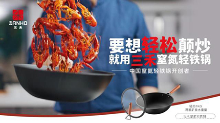 三禾锅具旨在为中国家庭带来轻松健康的烹饪环境,爆款三禾窒氮轻铁锅仅重1kg,两瓶矿泉水的重量,即使是力量弱的女士和老人都能做到单手颠炒;同时,锅身采用双层复合铁结构,外铝内铁的金属结合,使得铁锅既有铝轻巧、导热快的特性,又有着99.6%纯铁健康、耐用的优势,三禾窒氮轻铁锅上热快、受热均匀,锅底与锅壁的温差小,因此避免食物下锅因大温差而导致出现油烟的状况;此外,抗锈耐磨也是窒氮轻铁锅的一大优势,采用了三禾锅具独家窒氮专利,锅身的氮化层达到25-30微米,是普通铁锅的3-4倍,防锈能力强,一口铁锅可传家。
