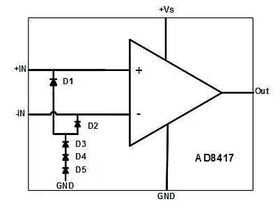 图 1 显示了在输入引脚和电源之间连接有二极管的放大器示例。二极管在正常工作条件下反向偏置,但当输入上升到高于正电源电压或低于负电源电压时变为正向偏置。当二极管正向偏置时,电流会通过放大器的输入流到相应的电源。
