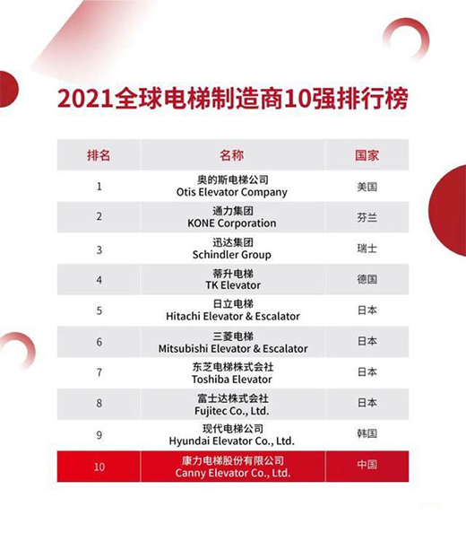 2021年9月,“2021全球电梯制造商10强”榜单重磅发布,再次引发业内外广泛关注。面对饱受疫情冲击、趋向复杂的全球市场,康力电梯依然交出一份靓丽的业绩答卷,并连续第5年跻身“全球电梯制造商10强”,是全球前十唯一中国品牌!