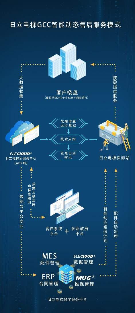 日立电梯“GCC智能动态售后服务质量提升的实践经验”以三级遥监中心为核心,对海量的电梯数据实时进行收集和处理,联动政府智慧平台的监管,结合企业的售后服务系统大数据分析,实现动态调整维保作业项目、自动故障报修派工和配件更换计划,指引维保人员前往地盘作业,最终实现“客户电梯预诊断→365*24小时智慧监控中心→自动派工计划→配件智能仓储→政企维保质量监管”的全业务管理。同时,日立电梯通过大数据分析改善机会,持续提升产品质量,为客户提供更加优质的产品。
