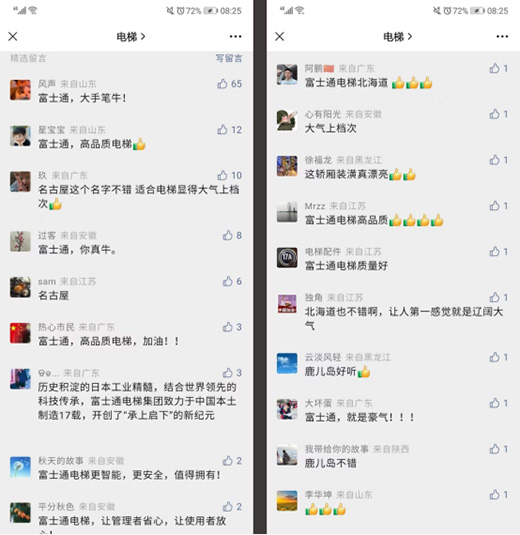 评选活动开展以来,广大网友积极参与,各分组票数不断上升,同时富士通电梯集团开设了留言功能,网友纷纷为评选活动留言点赞。