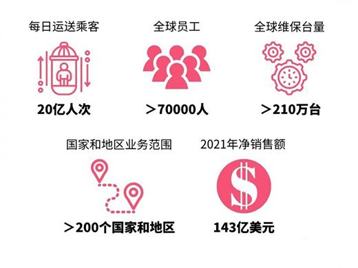 奥的斯的身影几乎遍布全球大都市,这家成立于1853年历史悠久的电梯业巨头,每天在全球运送乘客约20亿人次,拥有超过7万名员工,维保电梯和自动扶梯超210万台,规模居行业之首。2021年,奥的斯的业务范围覆盖全球超过200个国家和地区,净销售额达143亿美元。
