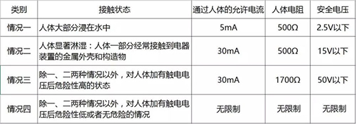 所以说,最可怕的不是电压,而是电流。正是电流才是造成事故的罪魁祸首,电压确实很无辜。我们常听说安全电压是36V,就被简单的认为只要低于36V,就是安全的了,这种想法是错误的。低于36V的时候,人也会发生触电事故。这个所说的36V是一般情况下,而且是在干燥的环境中。在干燥的环境中,人体的电阻在1000~2000Ω,在这种情况下,流过人体的电流很短短时间内不会立刻造成人伤亡,但是要是长期的接触而没有断开,一直是在接触着36V电压,人迟早是要发生事故的。我们国家不仅规定了36V,其实还有比36V更小的电压,规定中的最小的可以小到6V,这种事人长时间的接触情况下,也就是说当在6V以上时候并且长时间接触,人也是要出危险的。以下有个表格,可以参考一下: