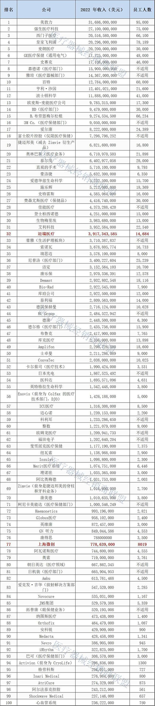 - 全球医疗器械企业100强——迈瑞医疗第32 上海微创77位! - 2022/09/17