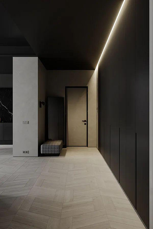 墙面的灯带多是内嵌式的,在一个合适的地方嵌入灯带,让平平无奇的墙面看起来很丰富,也很精致。墙面的灯带还可以与顶面相连,效果更突出。