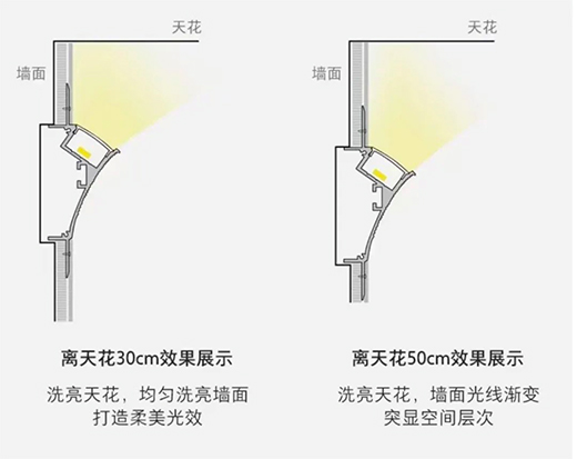 其次,这种洗墙灯带在安装方式上可以向上或向下发光,通过墙面的漫反射均匀发光。光线柔和,形成水一样冲刷墙面的效果,均匀照亮立面墙面,可以完美替代传统的回形灯槽吊顶。它有很多应用场景: